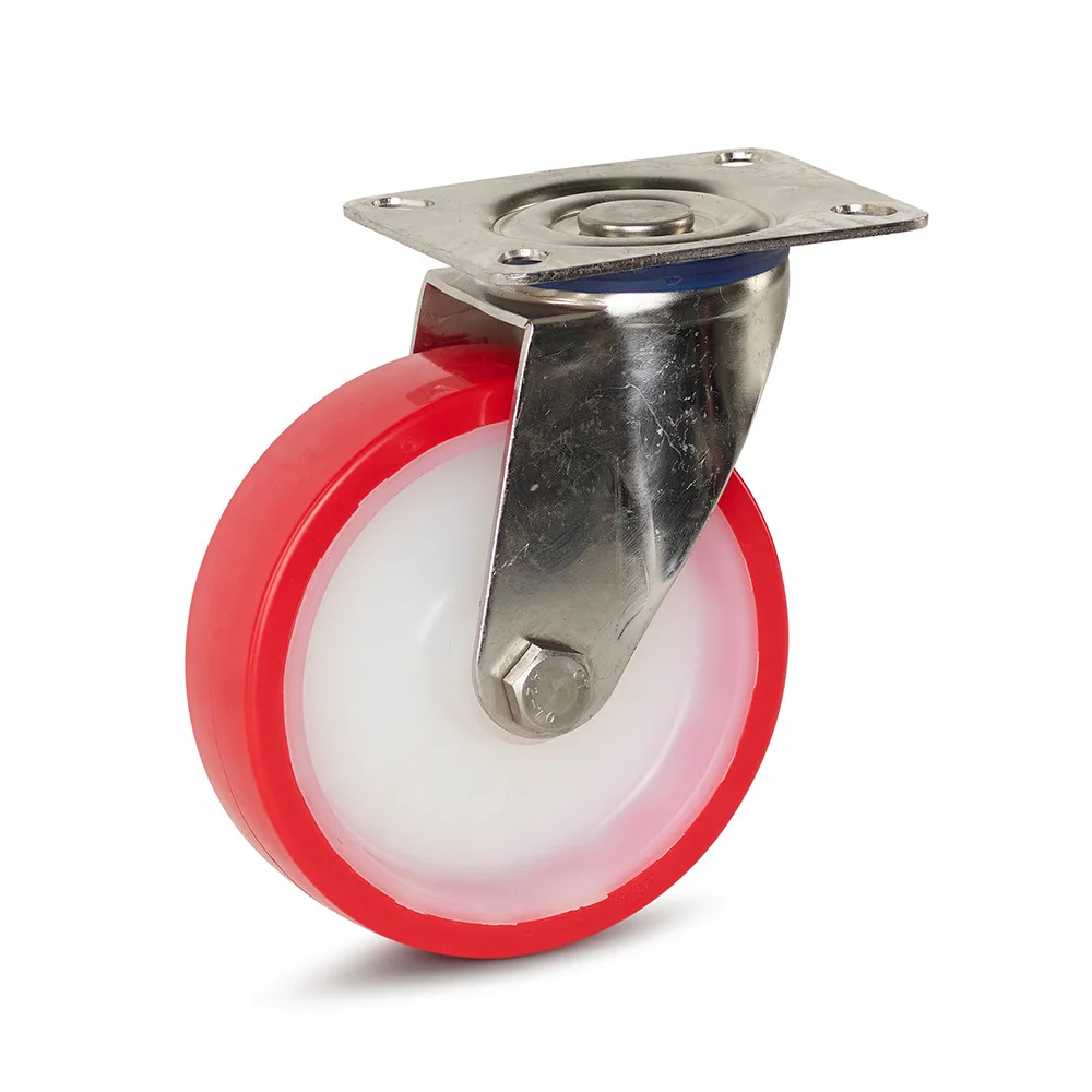 Edelstahl-Lenkrollen sind in Nylon für glatte Oberflächen und Polyurethan (PU) für etwas unebenere Böden erhältlich.