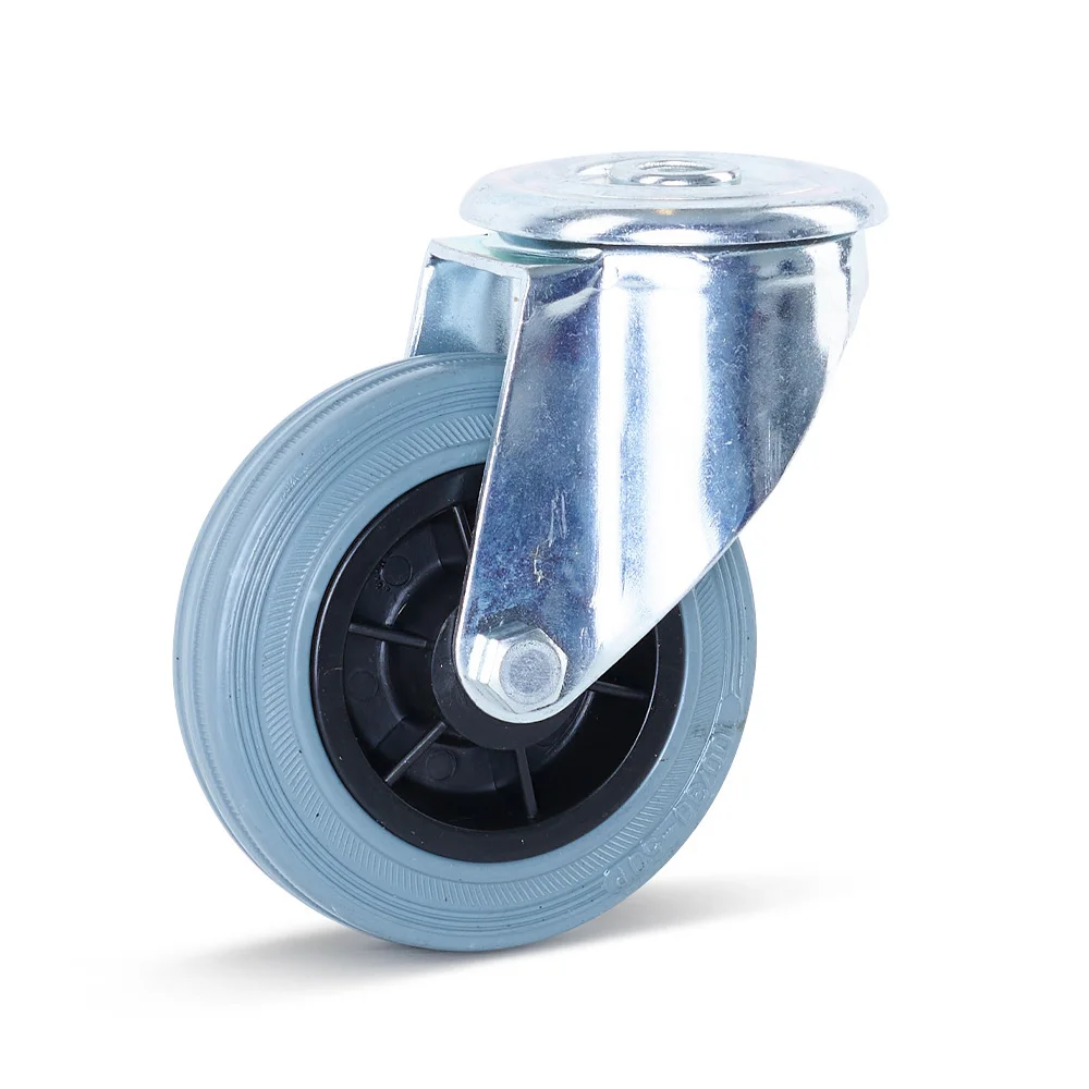 Diese graue Gummi-Lenkrolle hinterlassen keine Spuren auf dem Boden. Diese Gummi-Lenkrolle hat einen Durchmesser von 100 mm und eine Tragfähigkeit von 75 kg.