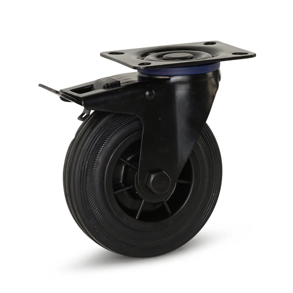 Schwarze Gummi-Lenkrolle gebremst mit Oberplatte - 125mm - 150kg