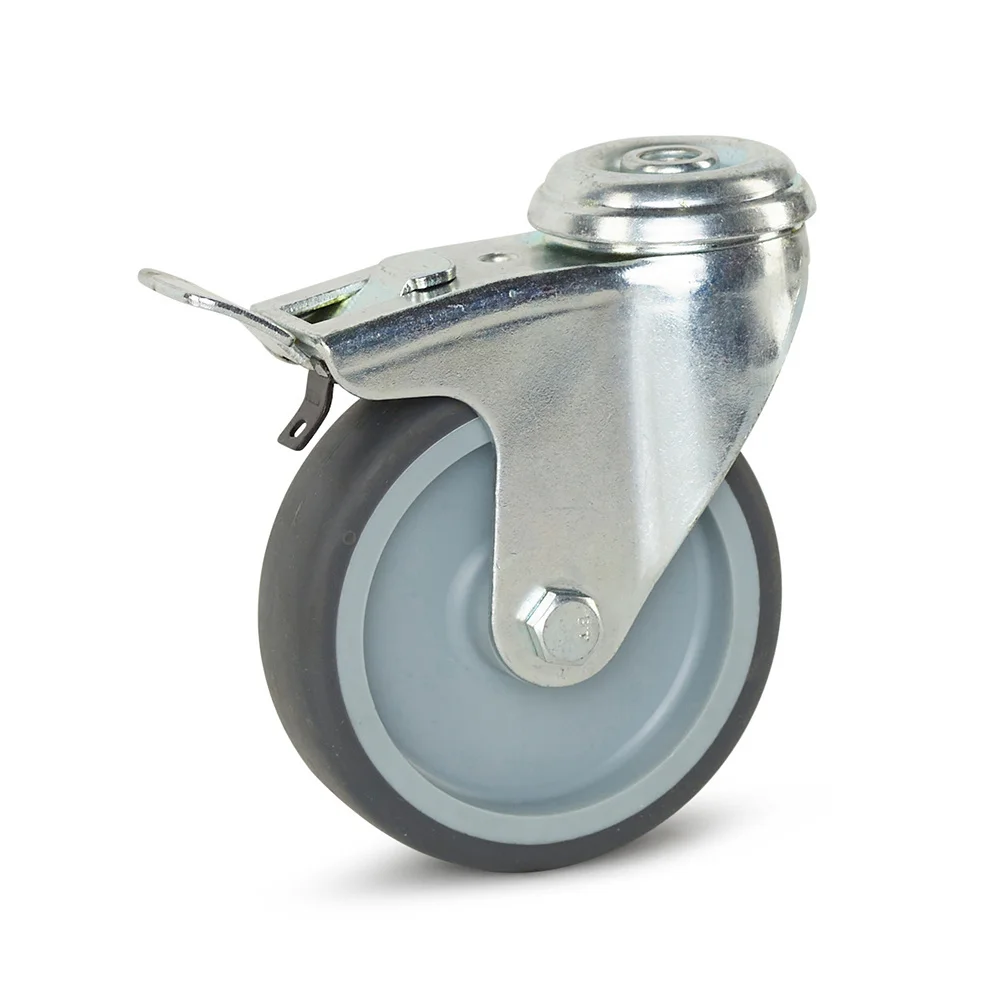 Diese Lenkrolle mit Bremse hat einen Durchmesser von 100 mm und eine Tragfähigkeit von 90 kg. Dieses Rad ist aus weichem TPR gefertigt und hinterlässt keine Streifen auf dem Boden.