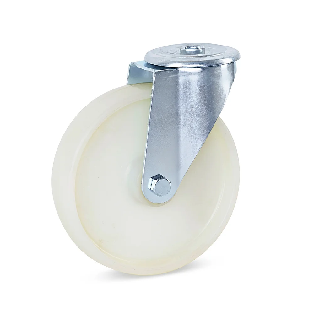 Rollen aus Nylon oder Polyamid sind sehr verschleißfest, haben eine hohe Tragfähigkeit und einen guten Rollwiderstand, weniger geeignet für unebene Böden und Schwellen, siehe PU-Räder oder elastische Gummiräder.