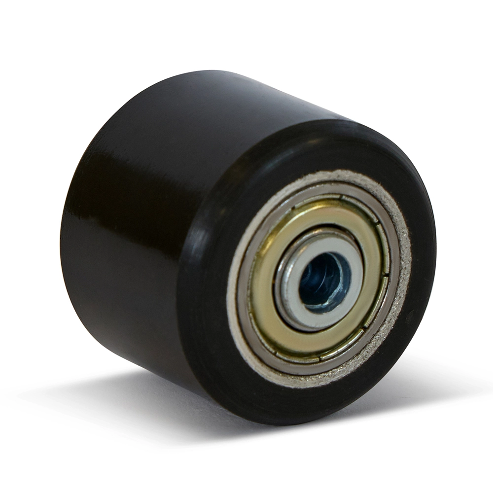 Kompaktes schwarzes PU-Rad mit hoher Tragfähigkeit von 100 kg, ideal für leichte Transportanwendungen.