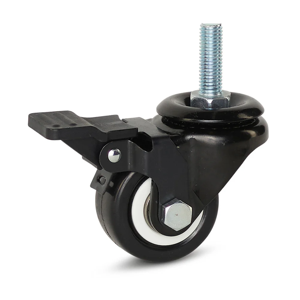 Kleine gebremste Lenkrolle mit Stift aus schwarzem PU mit einem Durchmesser von 50 mm und einer Tragfähigkeit von 60 kg. Der Reifen dieses ganz schwarzen Rades ist aus schwarzem PU und der Radkörper aus Polypropylen gefertigt.