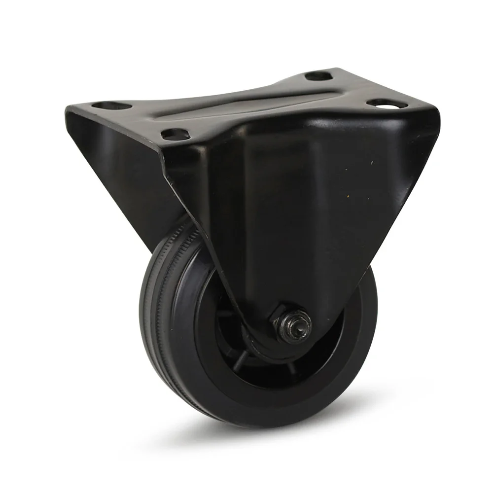 Diese Gummi-Starrrolle hat eine obere Platte, mit der das Rad einfach mit 4 Schrauben befestigt werden kann. Bockrollen werden am besten in Kombination mit 2 Lenkrollen oder 2 gebremsten Lenkrollen verwendet, da Bockrollen nur in 1 Richtung fahren können.