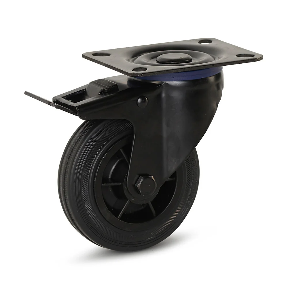 Schwarze Gummi-Lenkrolle gebremst mit Oberplatte - 100mm - 75kg